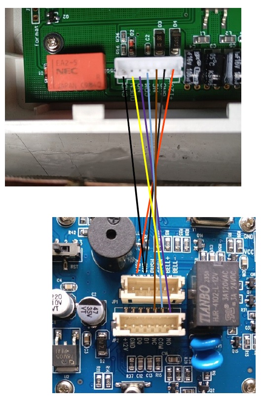 Del botón de apertura interno: una terminal a GND y la otra a OPEN del teclado